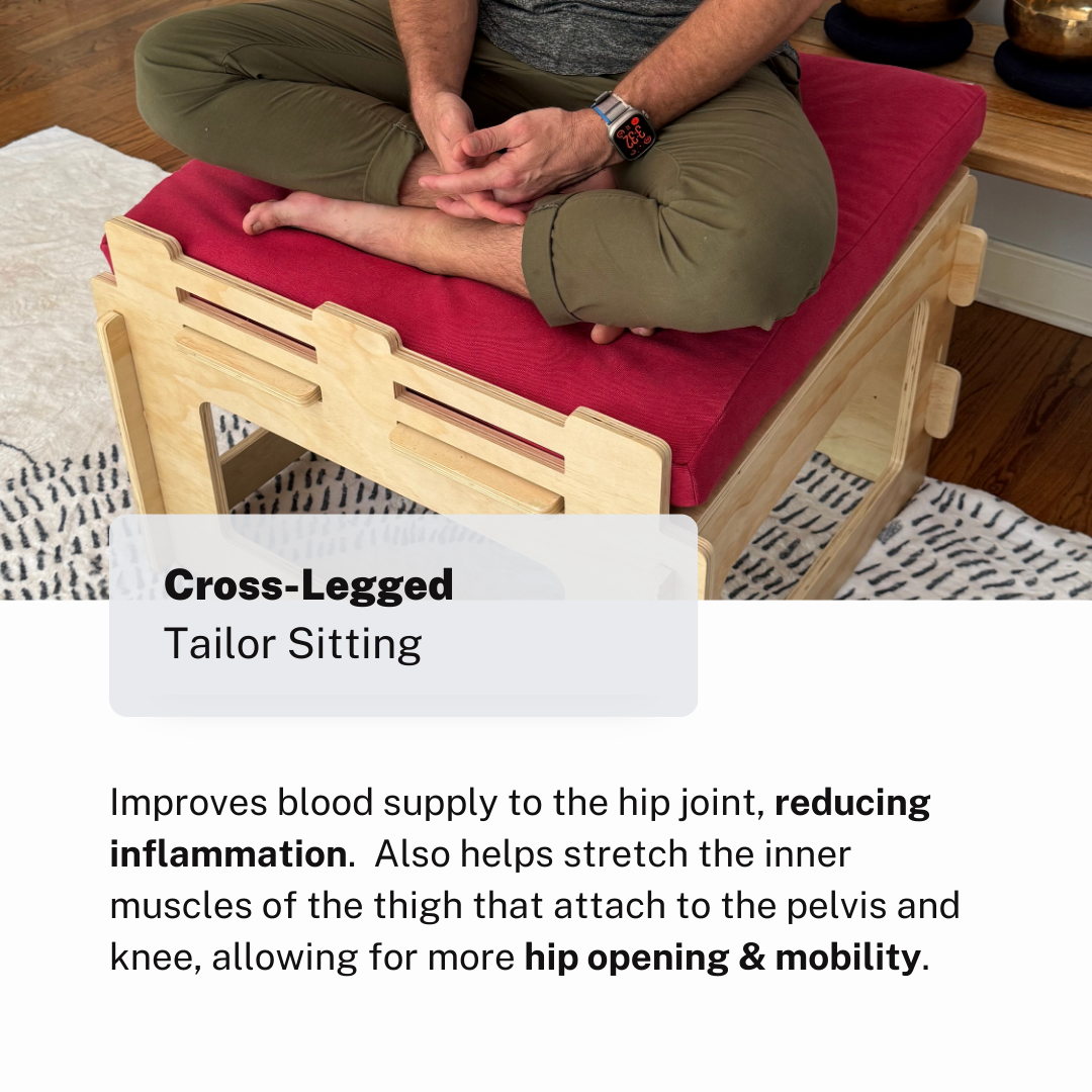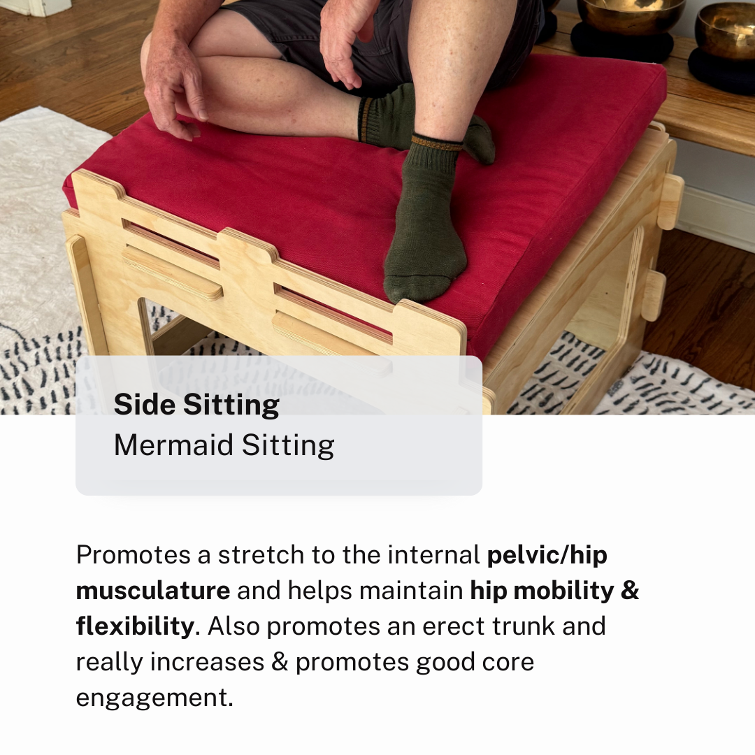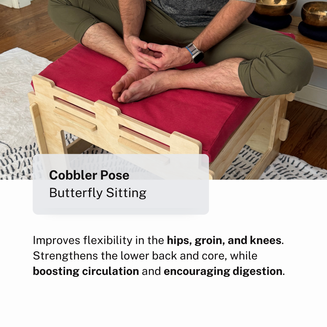 Woman sitting with soles of feet together on higher ground chair and black cushion