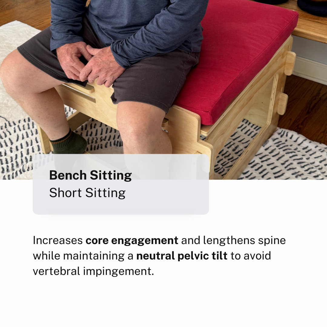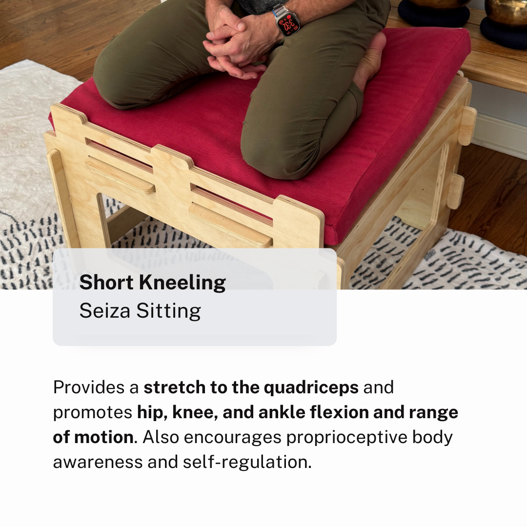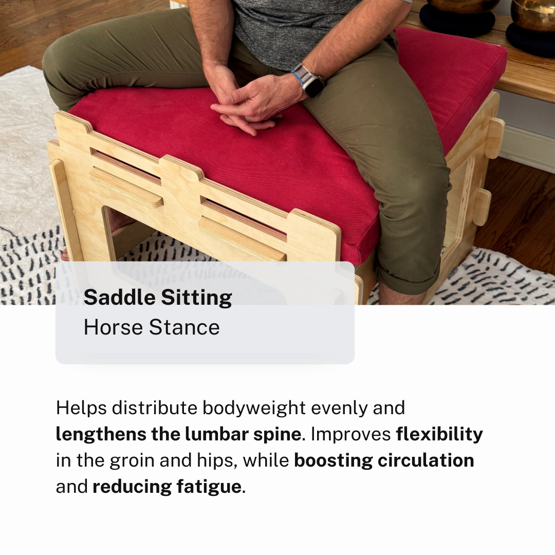 Woman sitting with soles of feet together on higher ground chair and black cushion